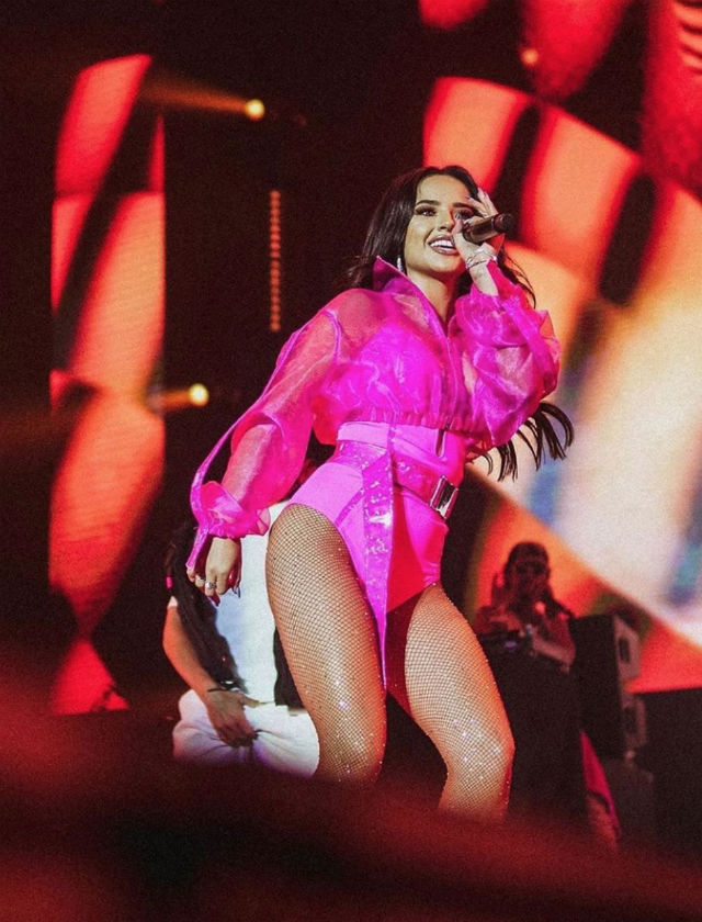 Para su concierto en España Becky G con color flúor fucsia, body, medias de red y blusa transparente.