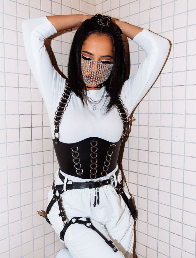 Becky G con un llamativo look formado por arneses, cadenas, etc.