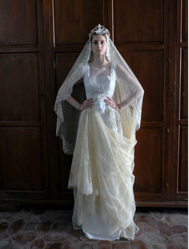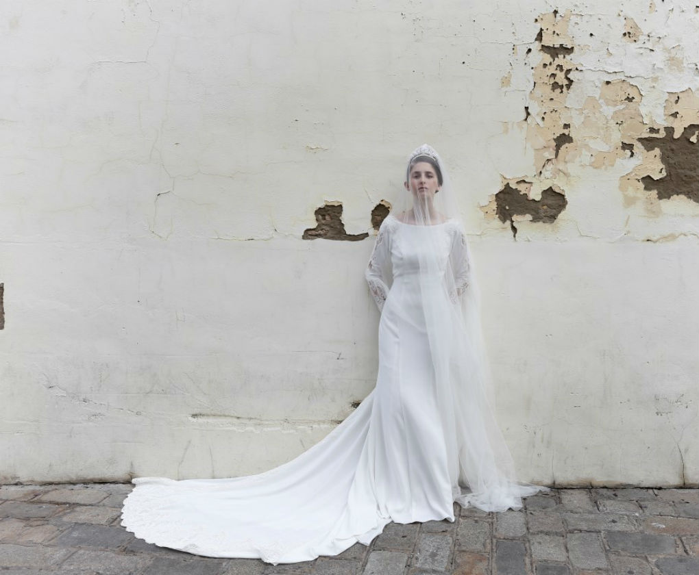 Vestido de novia de Carmen Vega y tiara de Benjamín Bulnes.