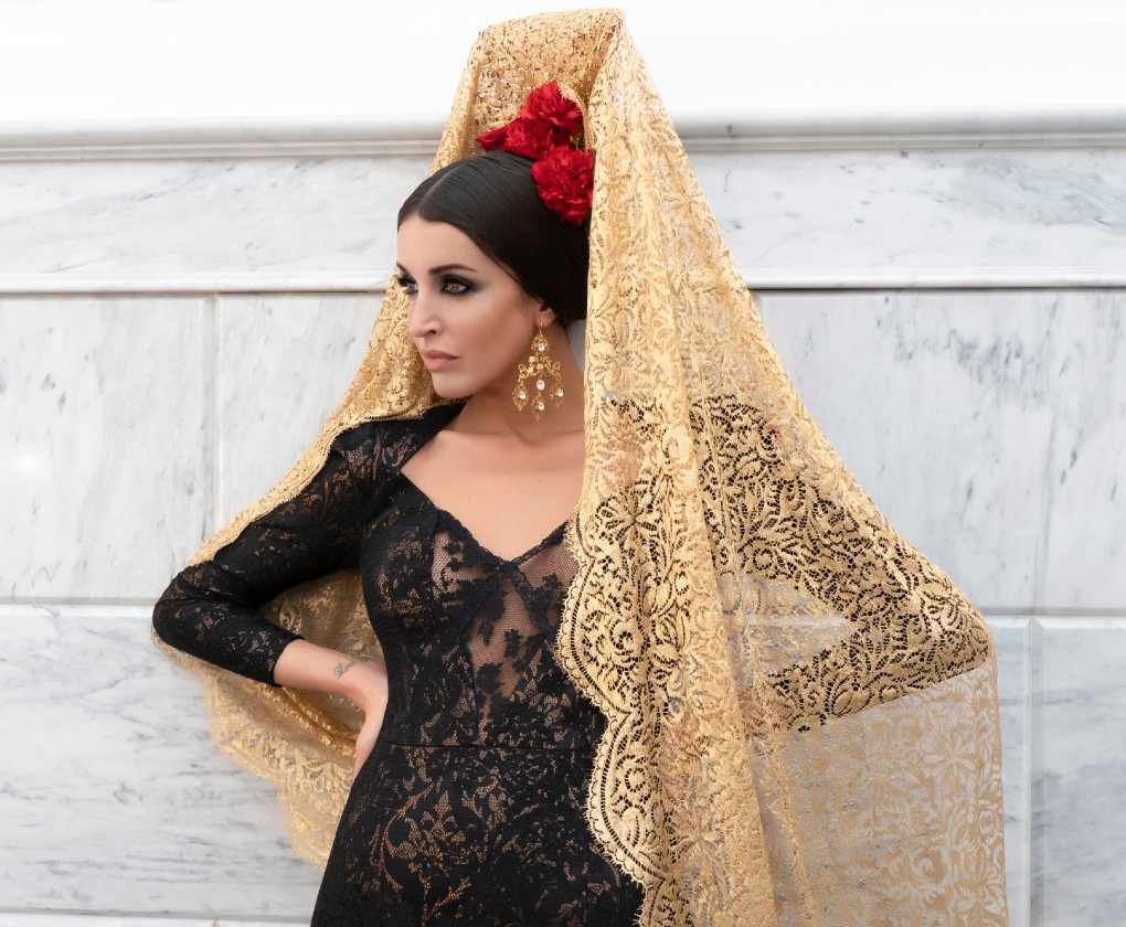 Noelia López con diseño de Atelier Rima y mantilla y peina de Antigüedades Rafael Villadiego