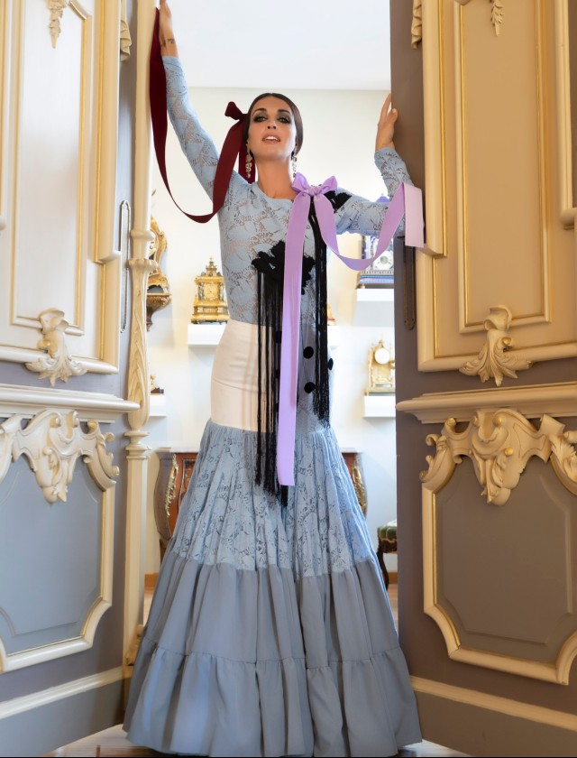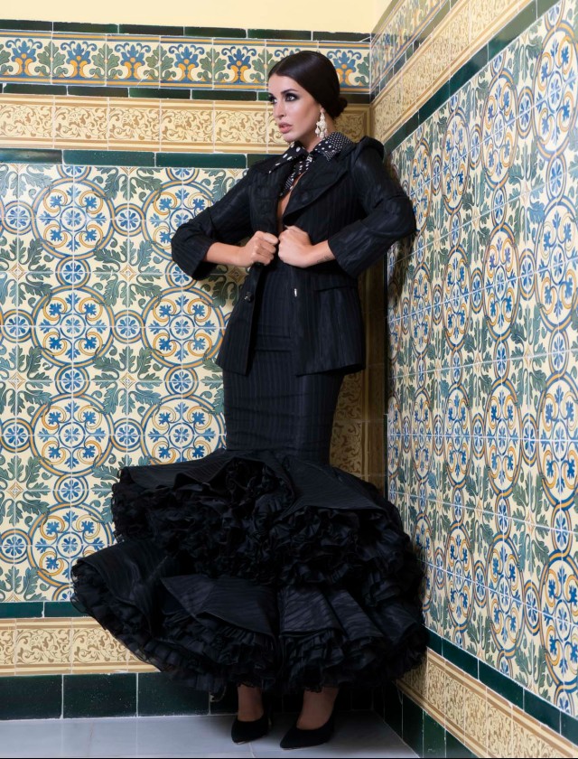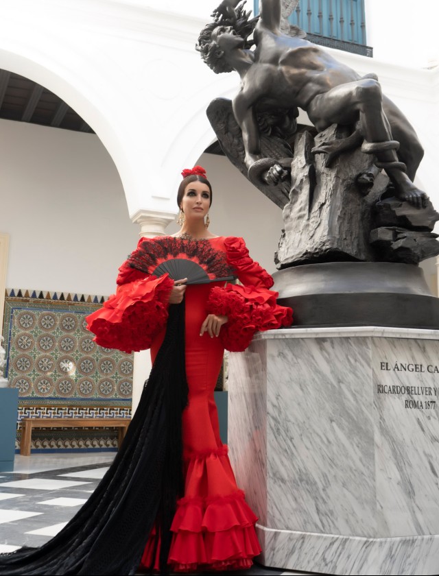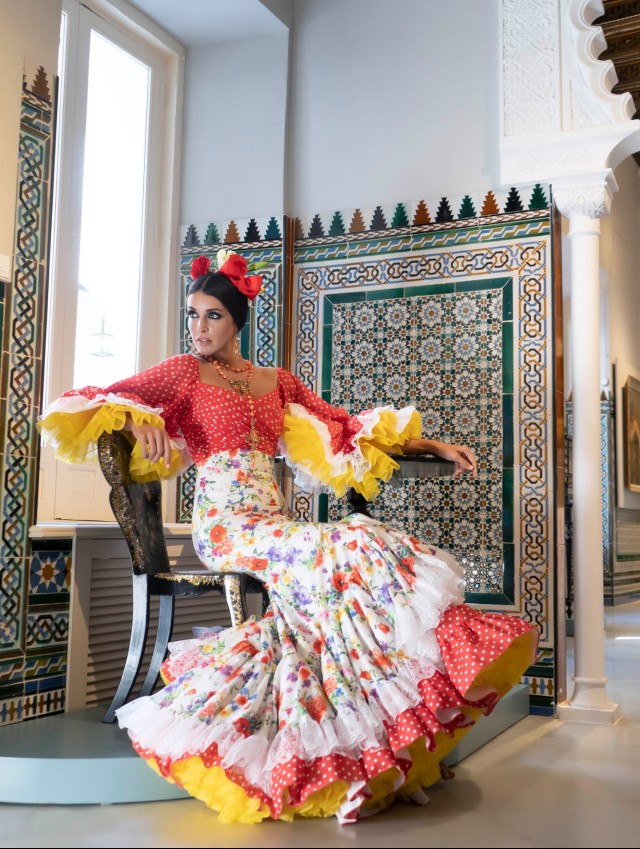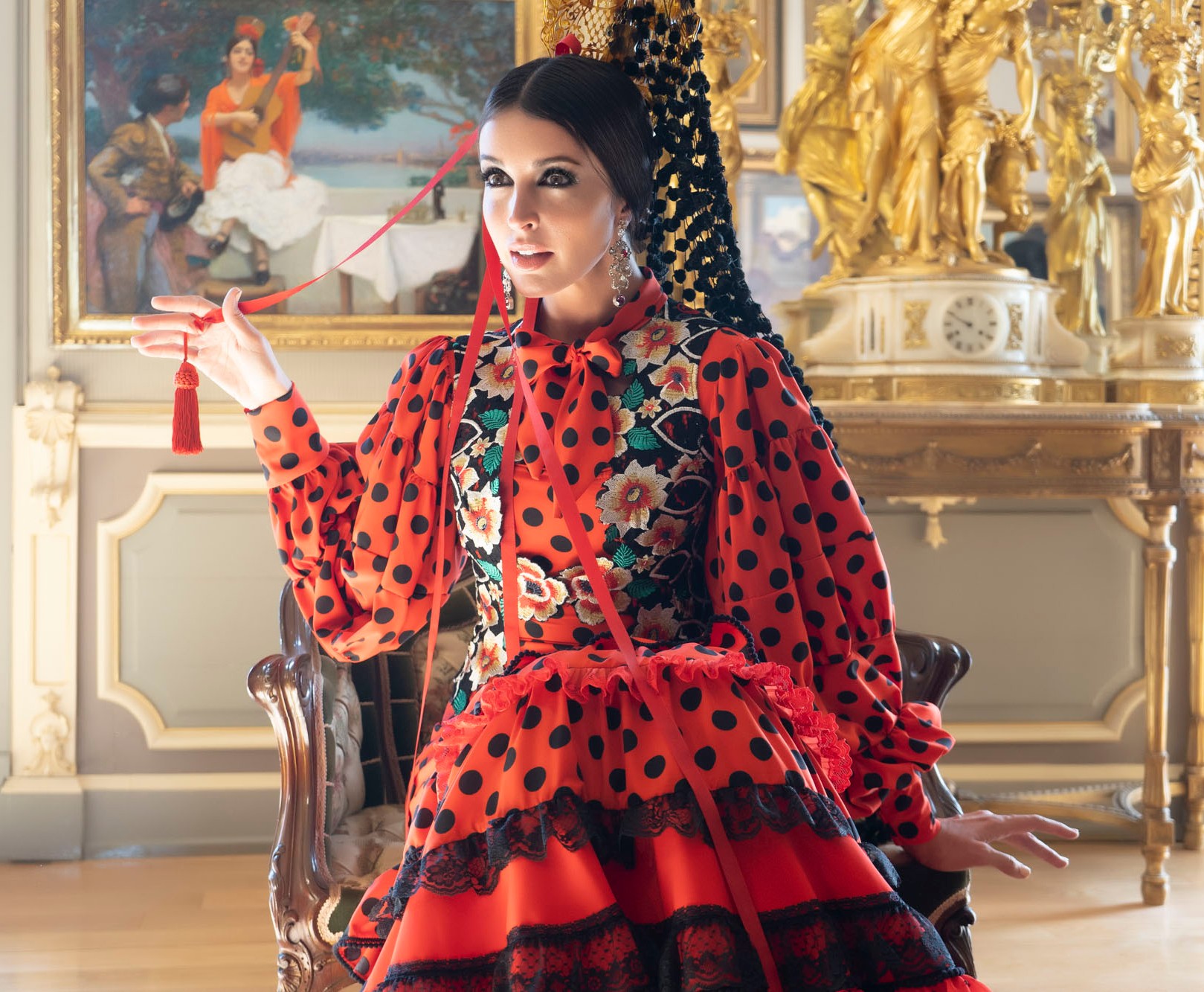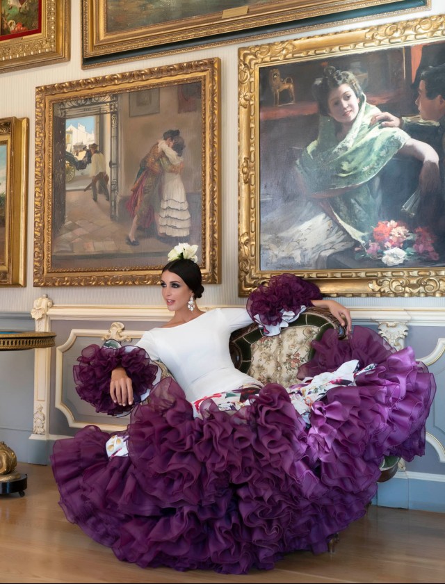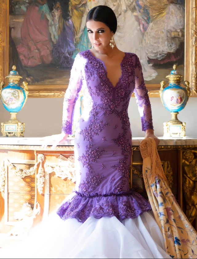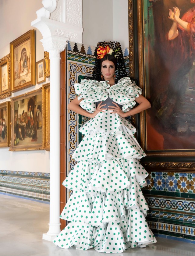 Noelia López con diseño de Carmen Latorre y bolsito y castañuelas de Antiguedades Rafael Villadiego