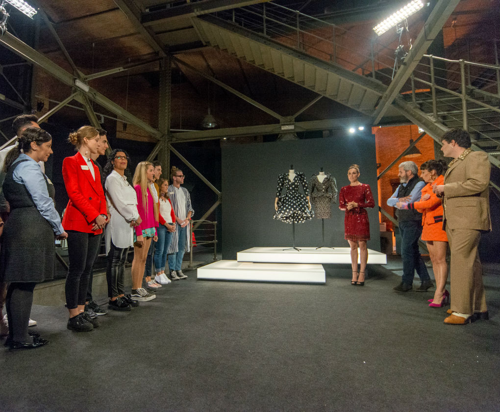 Alejandro Palomo junto a María Escoté, Lorenzo Caprile y Raquel Sánchez Silva, jurado y presentadora de Maestros de la Costura. RTVE