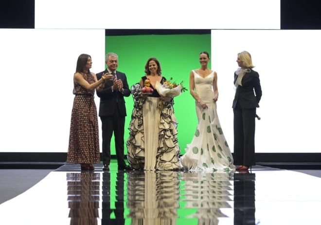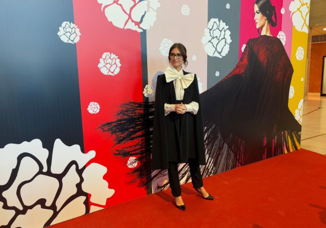 Vestida con un look de Antonio García en blanco y negro, con sus significativos lazos gigantes, la conocida actriz hacia eco del simbolismo de la moda flamenca y su infancia, sabiendo que SIMOF ha ayudado a que toda su familia y sus amigos amantes de la cultura sureña, al igual que miles de andaluces, tuvieran un hueco cada año en FIBES.