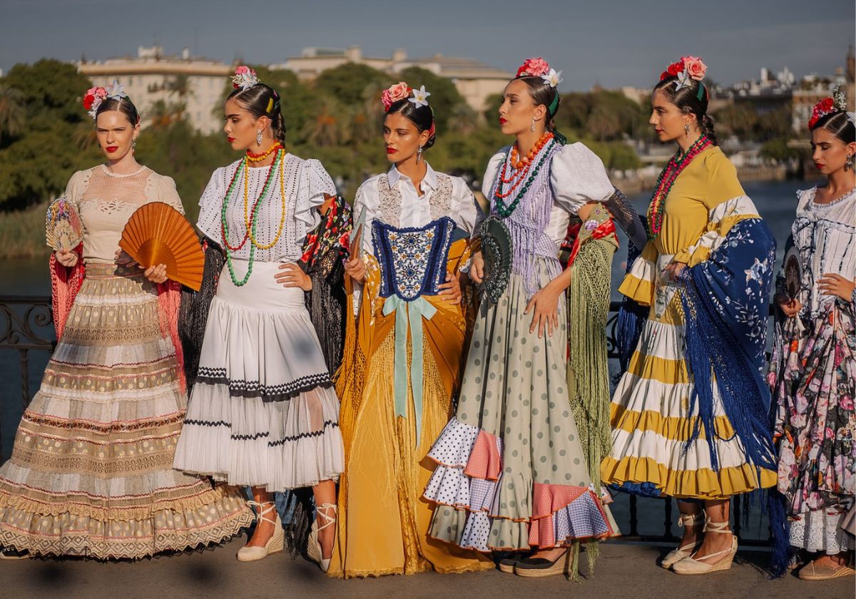 El vestido, ahora convertido en todo un símbolo, ha destacado por sus faldas con volumen o canasteras, corpiños, coloridos volantes y una elegante mezcla de telas que rinden homenaje a la vestimenta de las cigarreras de Triana. Como complementos: mantones de manila, abanicos y flores que hacen un guiño a los patios y balcones de Triana: Azucenas, claveles, campanillas o el jazmín.