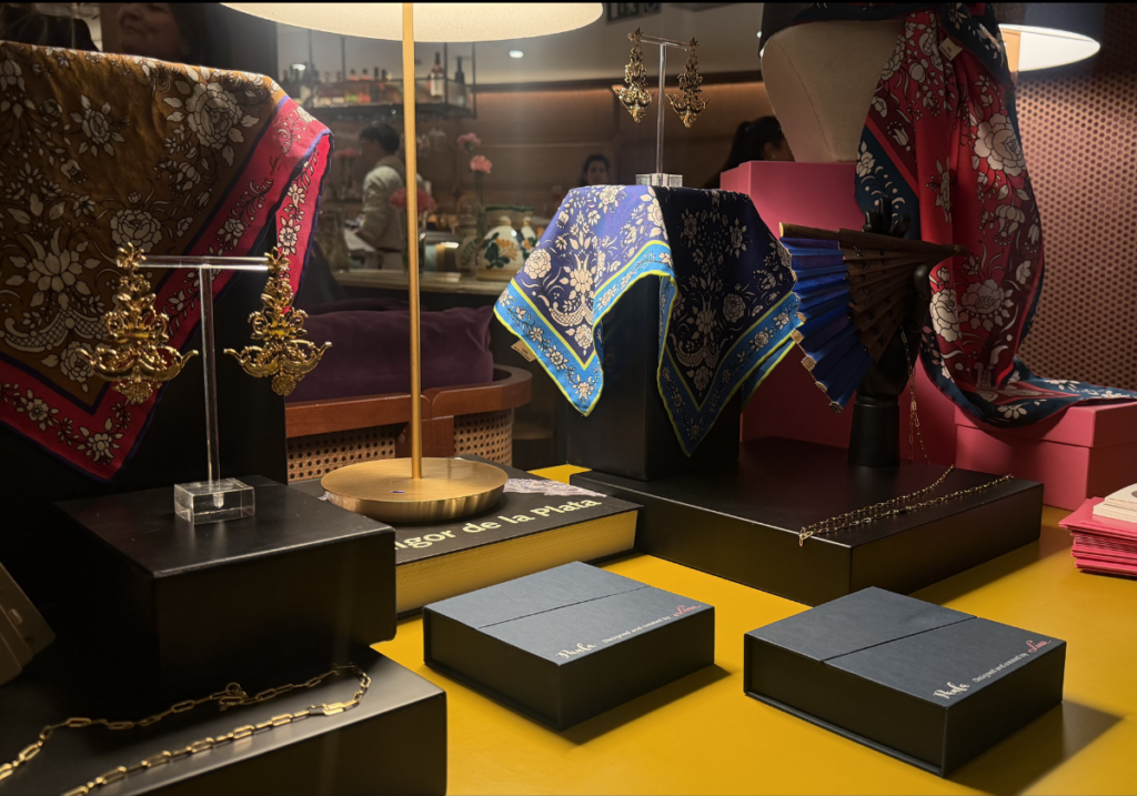 Uno de los hitos de la colección ha sido la colaboración con el taller cordobés Paula Orfebres, responsable de una línea exclusiva de joyería desarrollada junto a Lina Sevilla. Bajo el lema ‘Del concepto a la materia’, los dibujos y bordados característicos de los mantones han sido traducidos al metal mediante un complejo proceso artesanal. Las piezas, elaboradas en plata y terminadas con baño de oro de 24 quilates, reproducen la esquina de un mantón, trasladando simbólicamente el tejido desde los hombros hasta el rostro. La creación ha requerido meses de prototipado, microfusión y ensamblaje manual por parte de artesanos especializados.