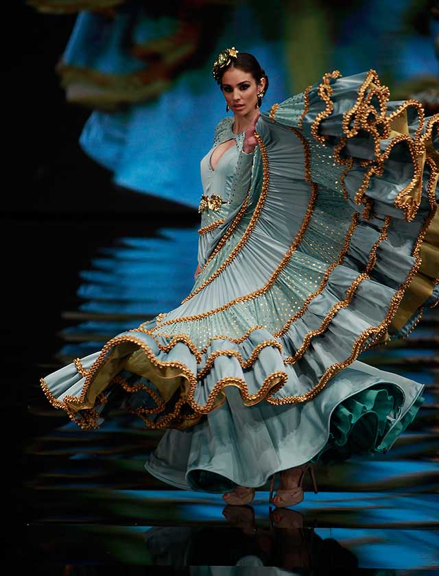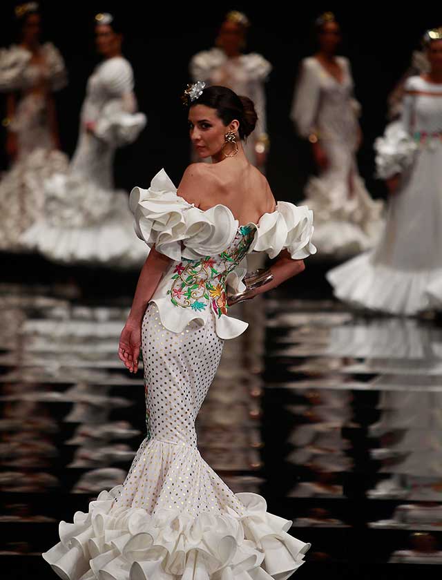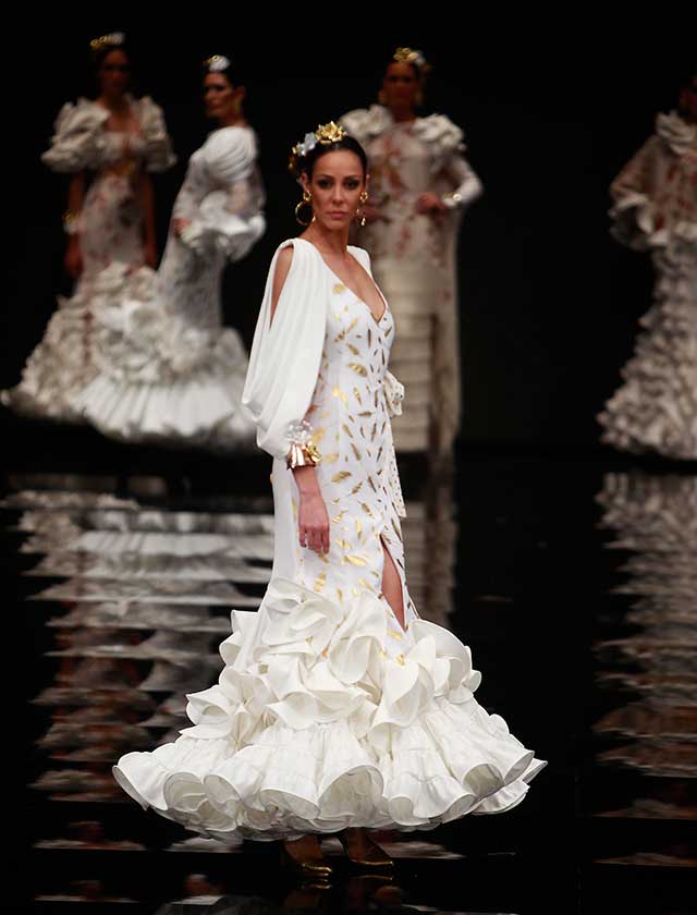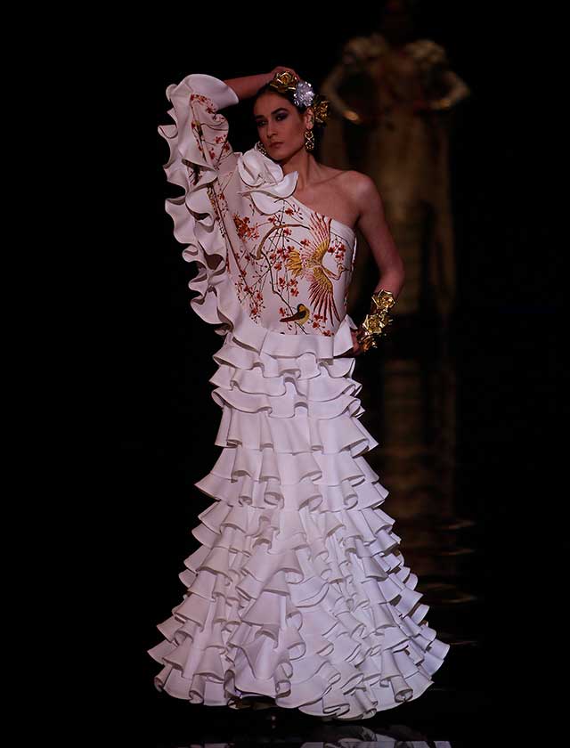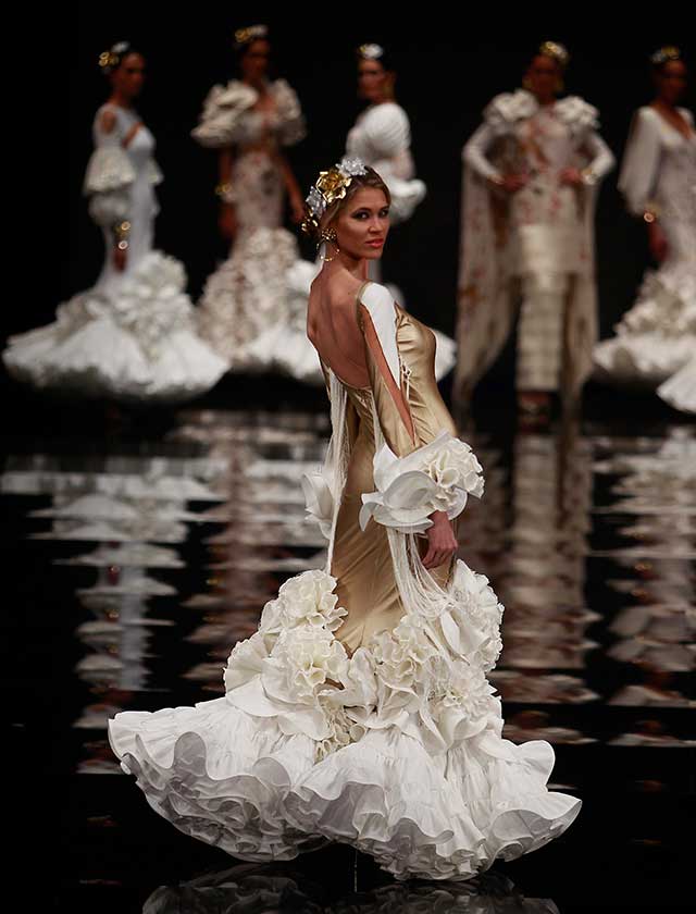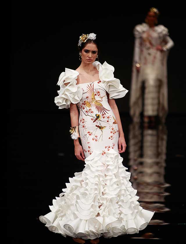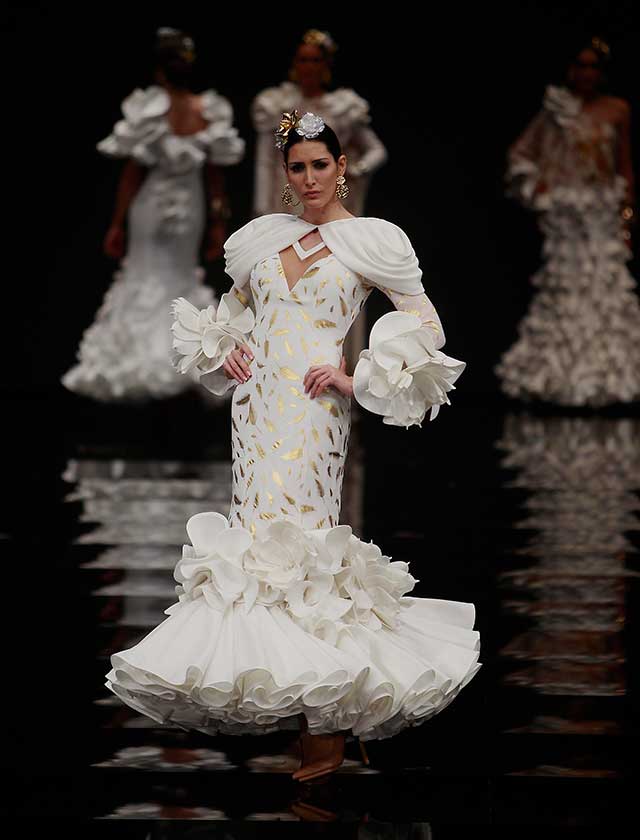 La diseñadora Ana Morón ha presentado «Volaré», una colección de vestidos que modernizan las formas y texturas con estudiados volúmenes y transparencias que crea una silueta flamenca más contemporánea (J. M. Serrano / Raúl Doblado)