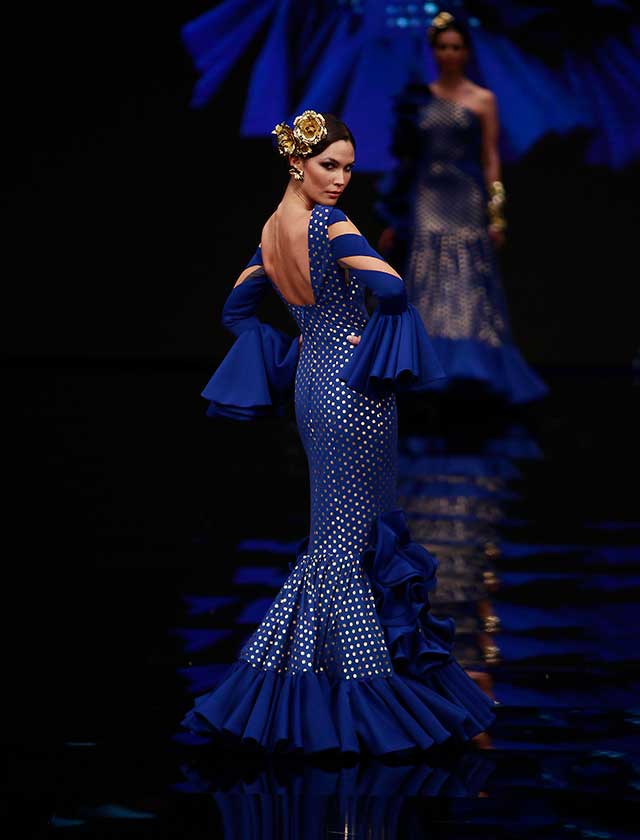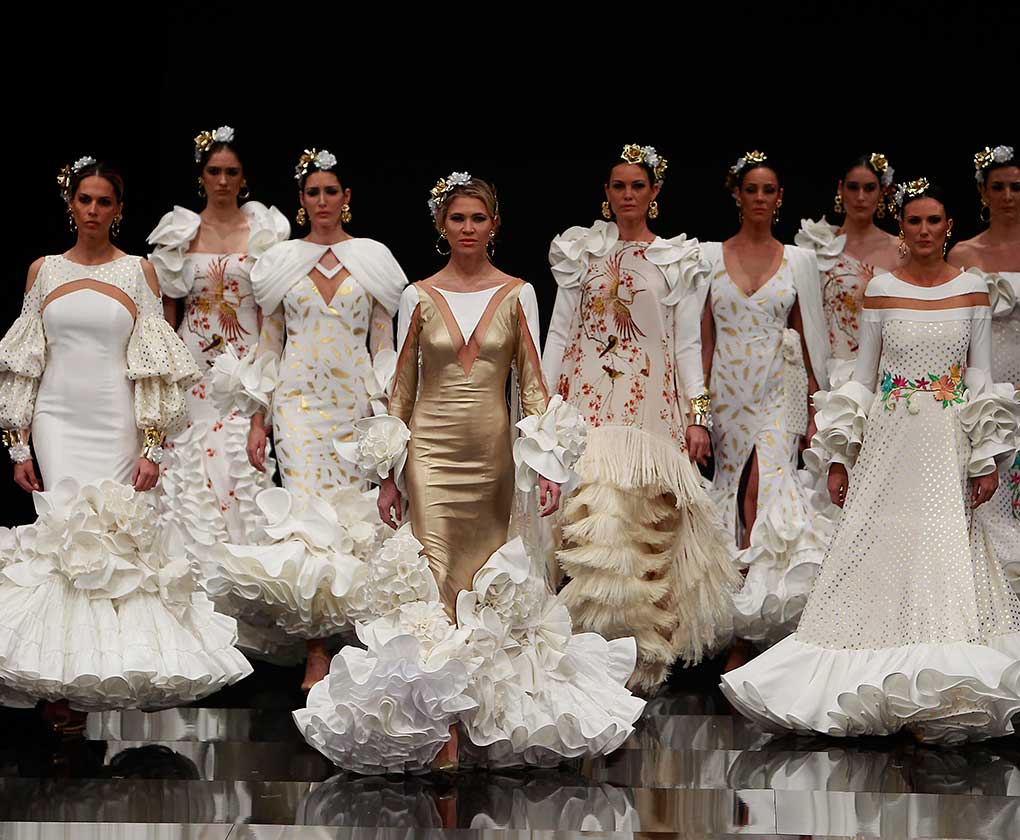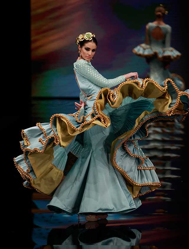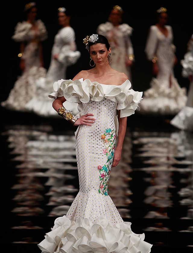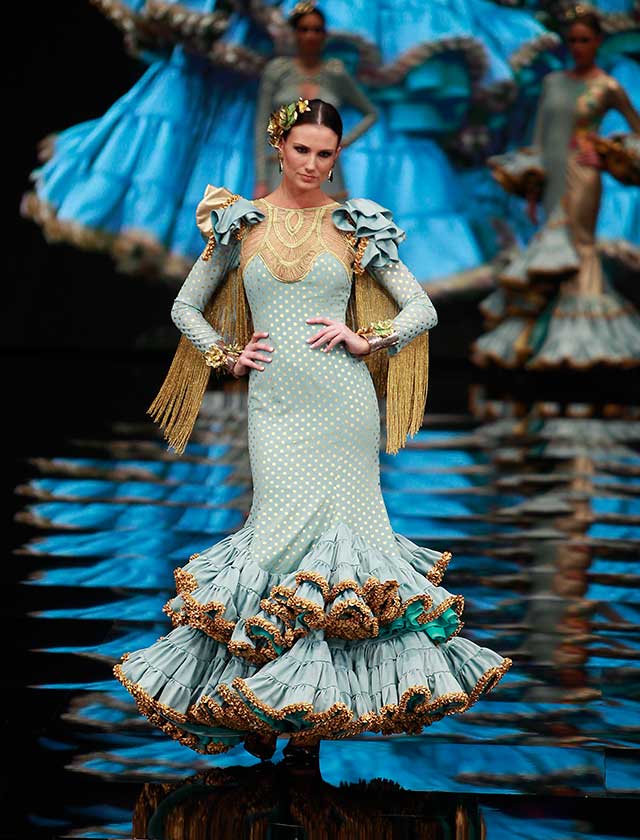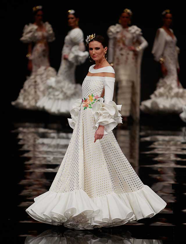 La diseñadora Ana Morón ha presentado «Volaré», una colección de vestidos que modernizan las formas y texturas con estudiados volúmenes y transparencias que crea una silueta flamenca más contemporánea (J. M. Serrano / Raúl Doblado)