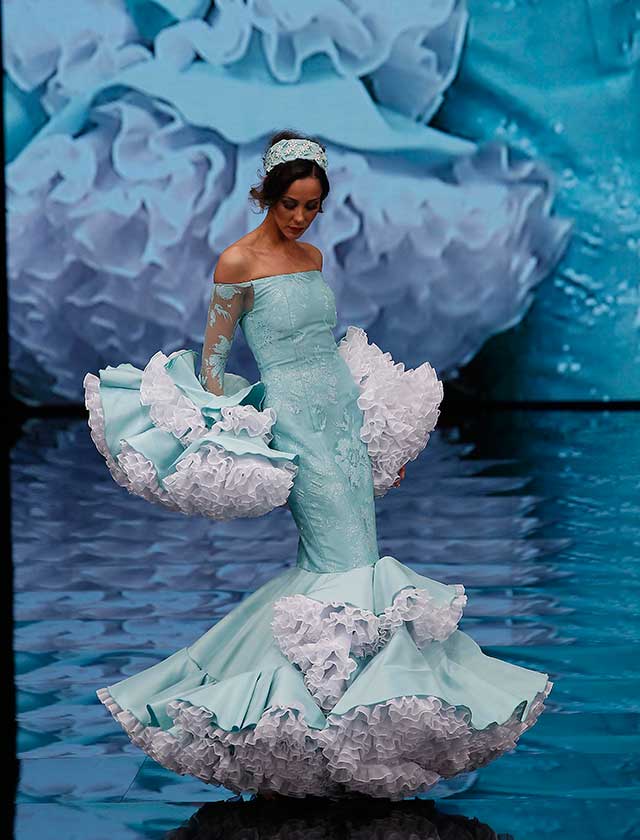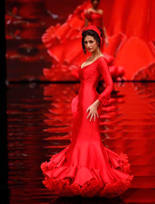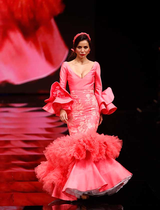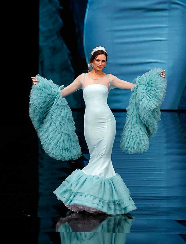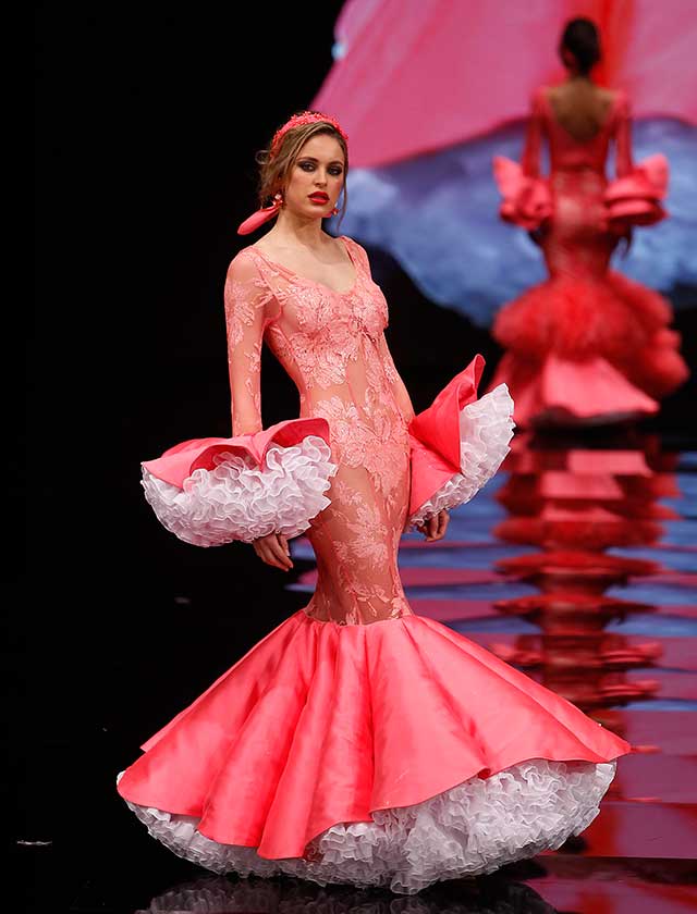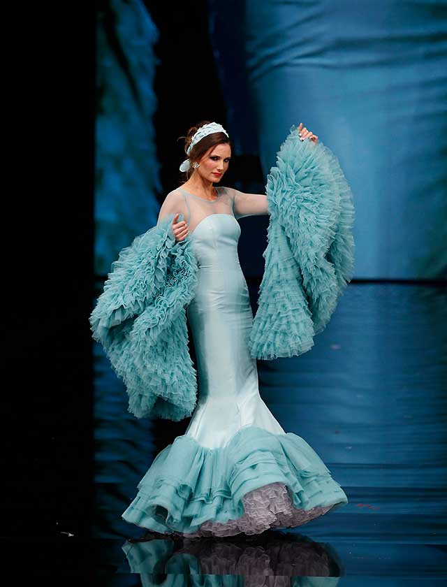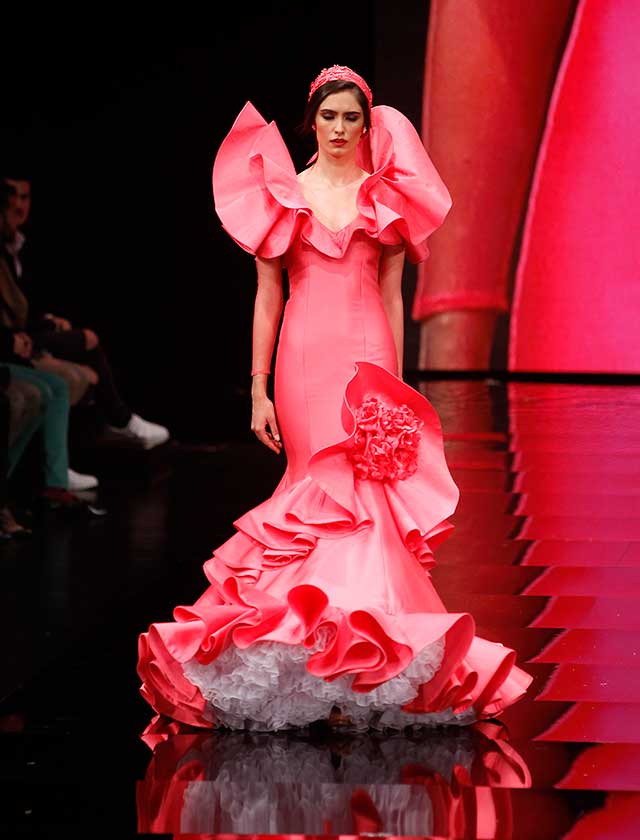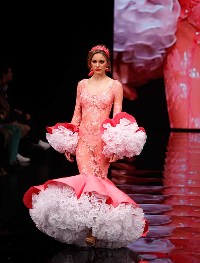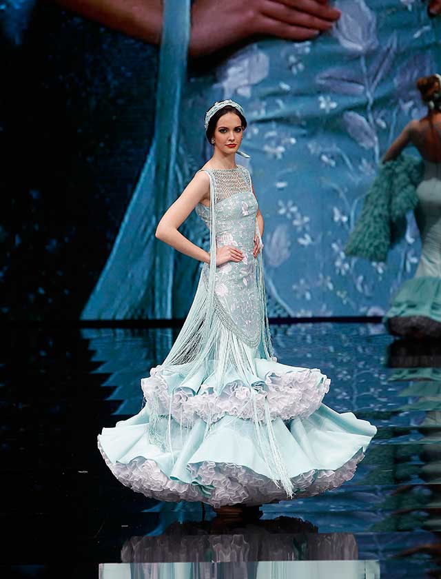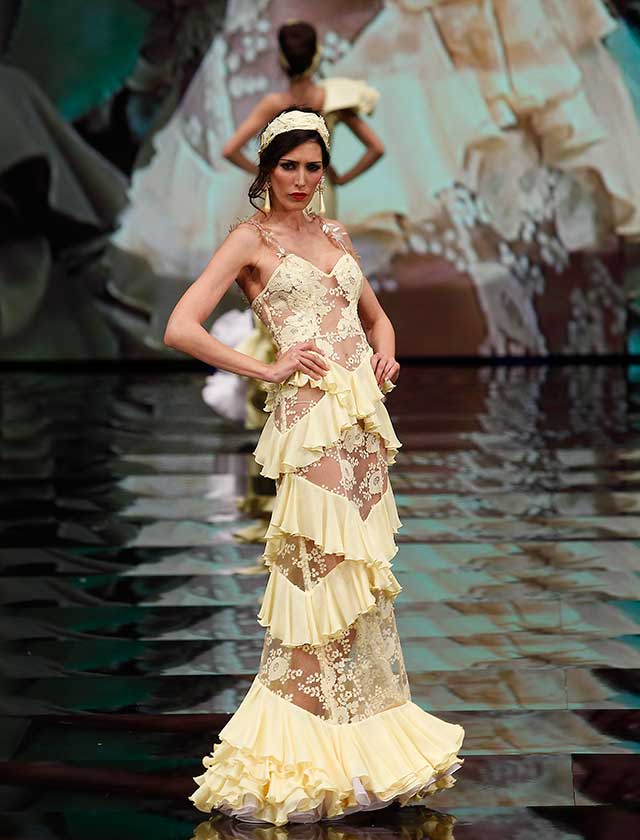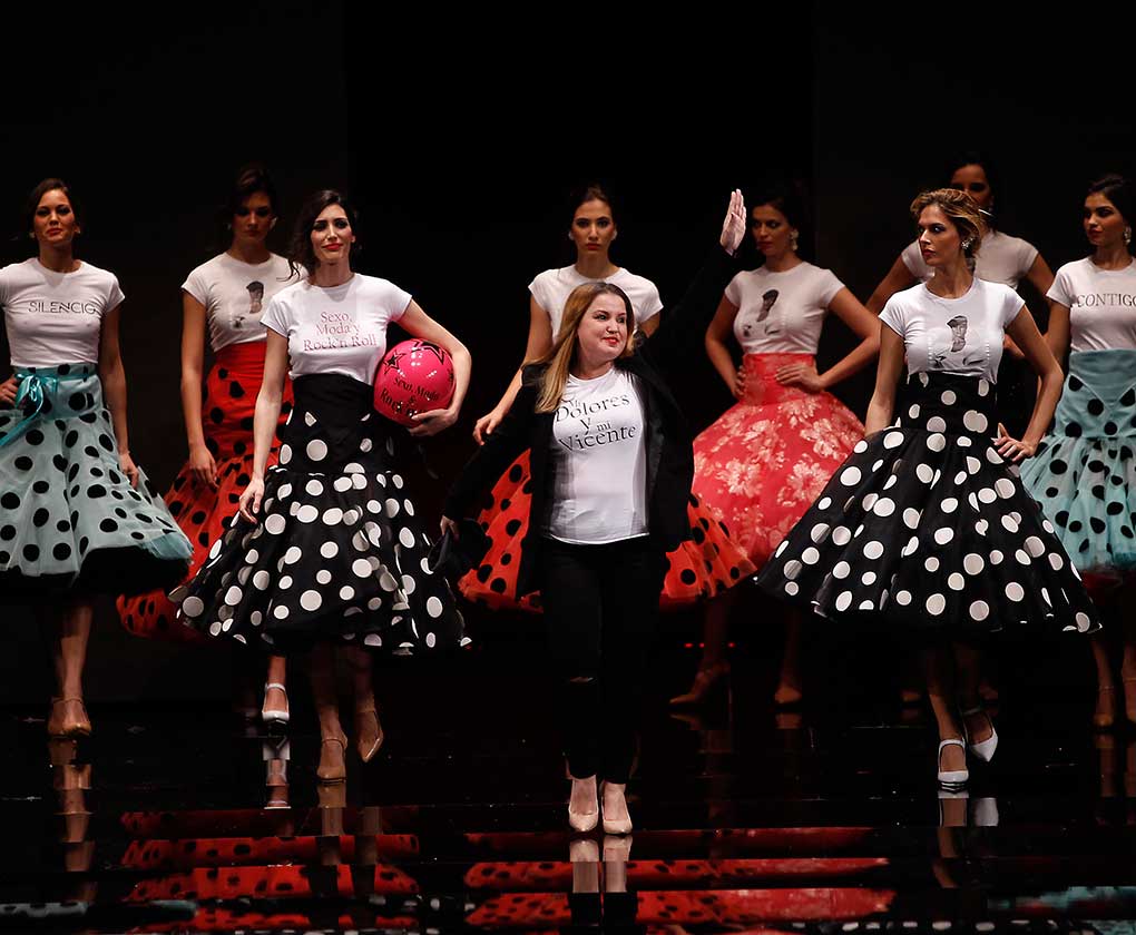 Cristina García: La colección «Mi Dolores» está inspirada en un amor de los de antes. Desde la pureza de dos jóvenes que se conocen, representada en el color blanco, hasta la pérdida del amor sólo separado por la muerte, representado en el color negro, pasando por la dulzura de los primeros besos (amarillo y melocotón) y la pasión de sus cuerpos (rosas y rojos). (J. M. Serrano / Raúl Doblado)
