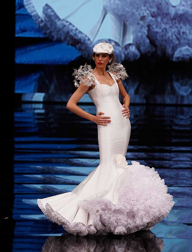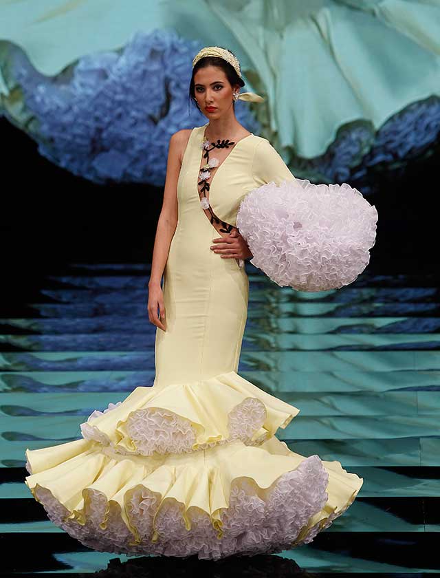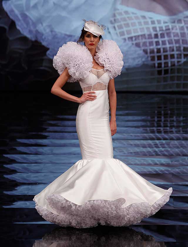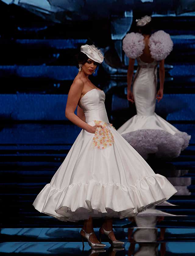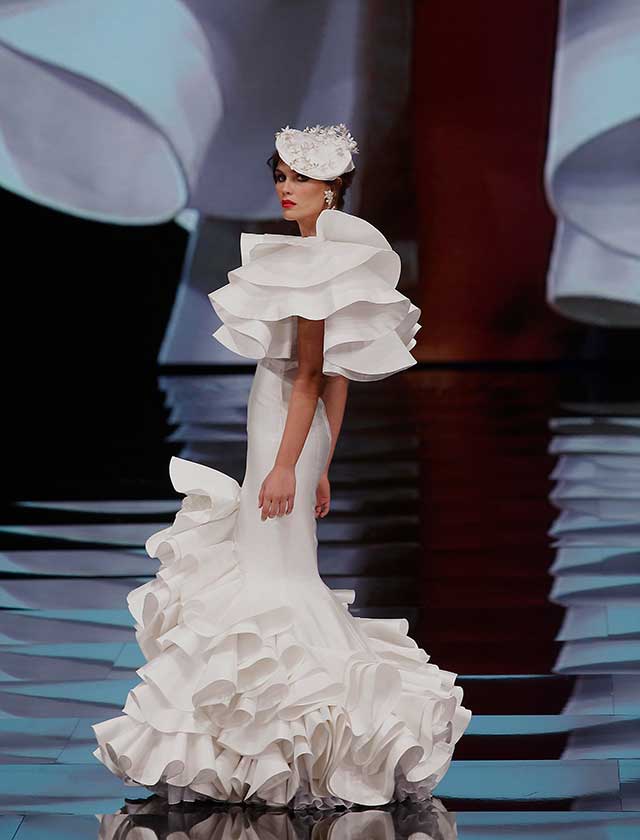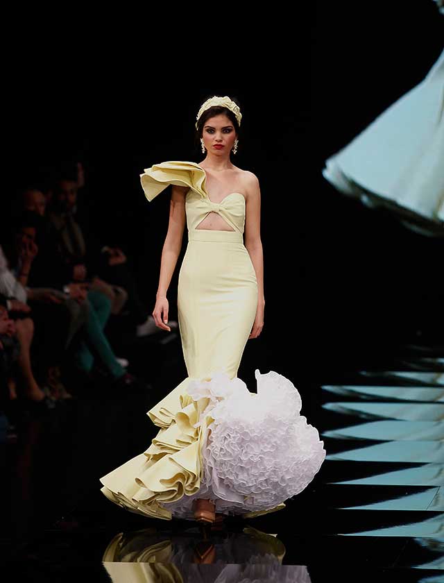 La colección «Mi Dolores» de Cristina García está inspirada en un amor de los de antes. Desde la pureza de dos jóvenes que se conocen, representada en el color blanco, hasta la pérdida del amor sólo separado por la muerte, representado en el color negro, pasando por la dulzura de los primeros besos (amarillo y melocotón) y la pasión de sus cuerpos (rosas y rojos). (J. M. Serrano / Raúl Doblado)