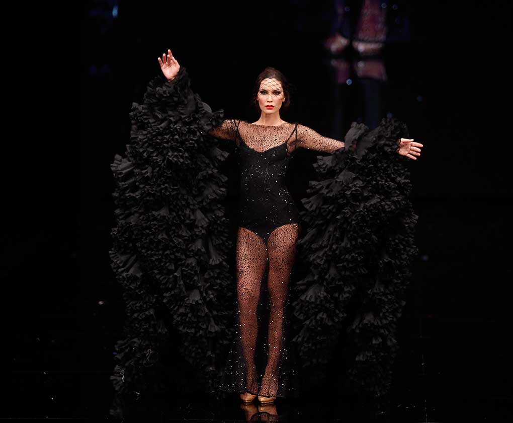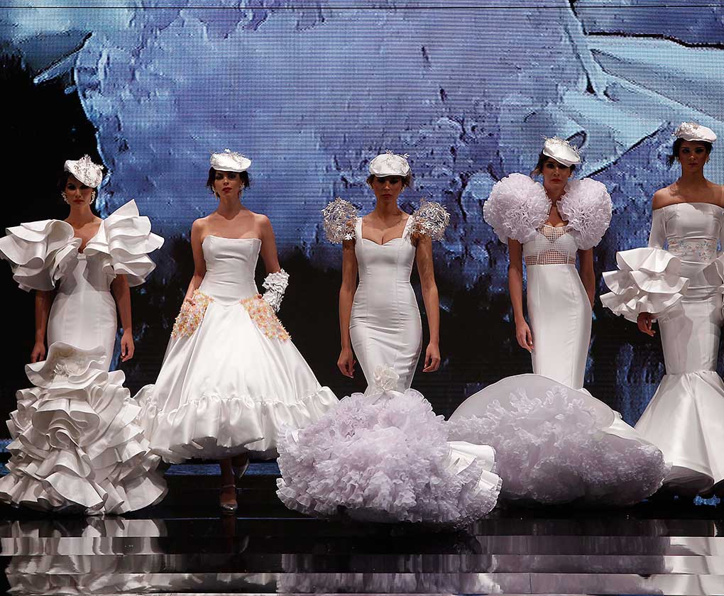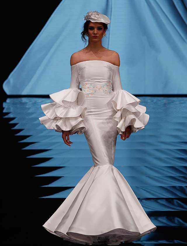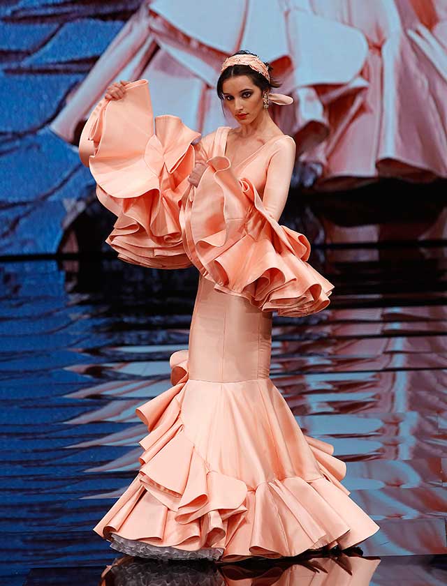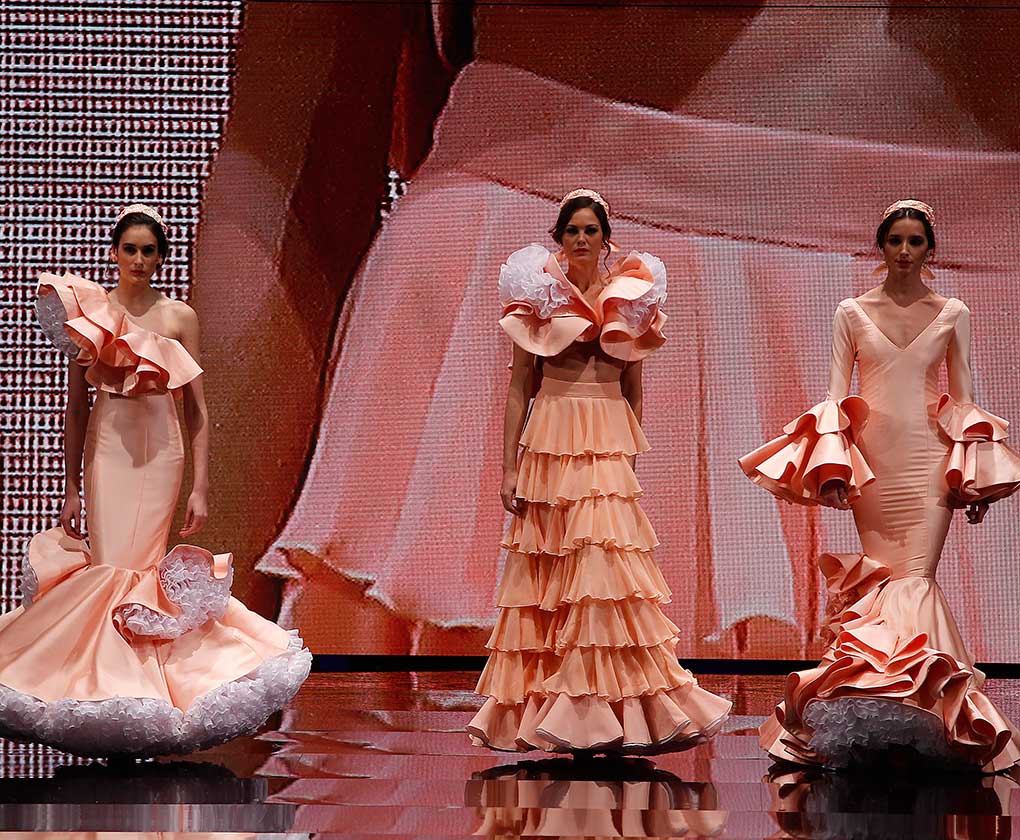 La colección «Mi Dolores» de Cristina García está inspirada en un amor de los de antes. Desde la pureza de dos jóvenes que se conocen, representada en el color blanco, hasta la pérdida del amor sólo separado por la muerte, representado en el color negro, pasando por la dulzura de los primeros besos (amarillo y melocotón) y la pasión de sus cuerpos (rosas y rojos). (J. M. Serrano / Raúl Doblado)