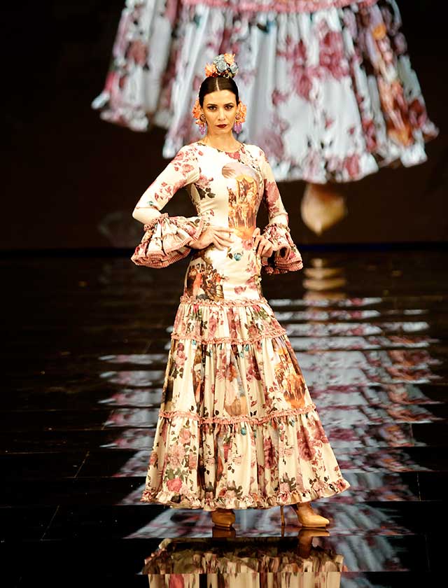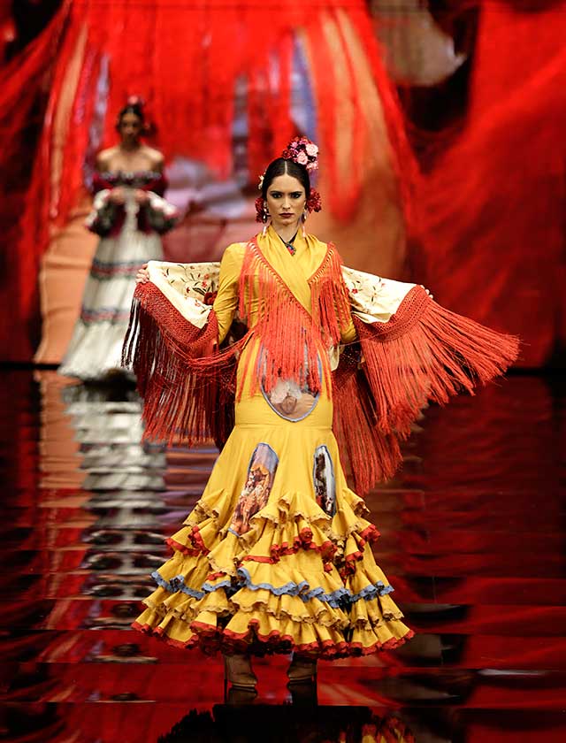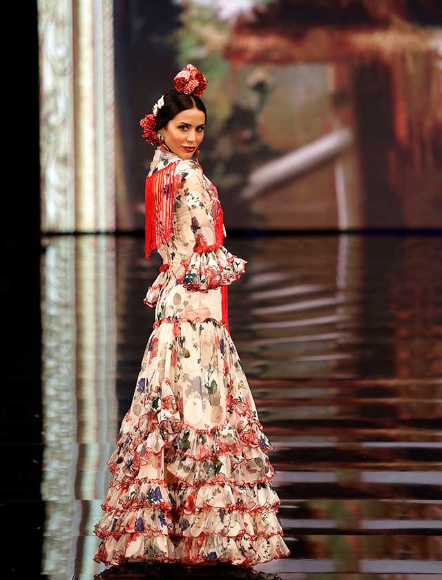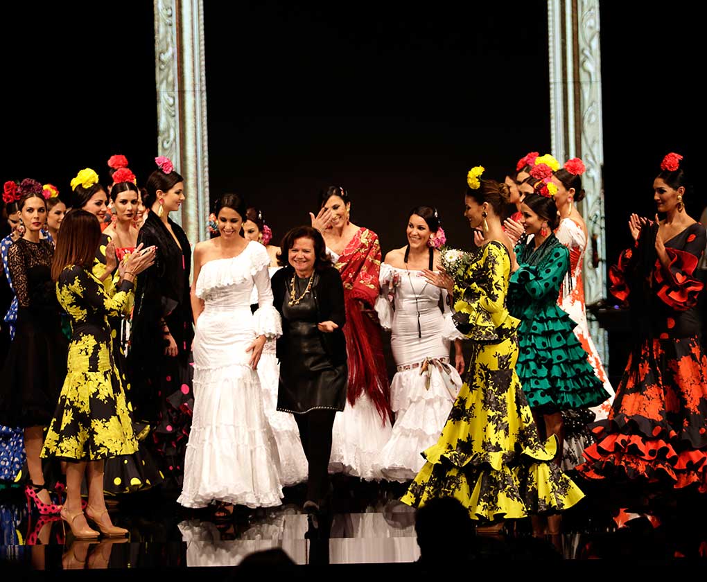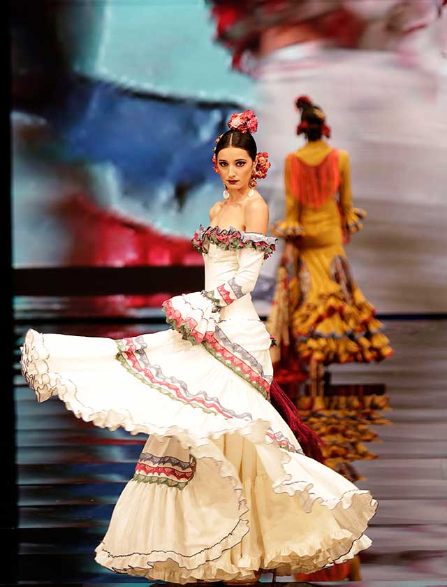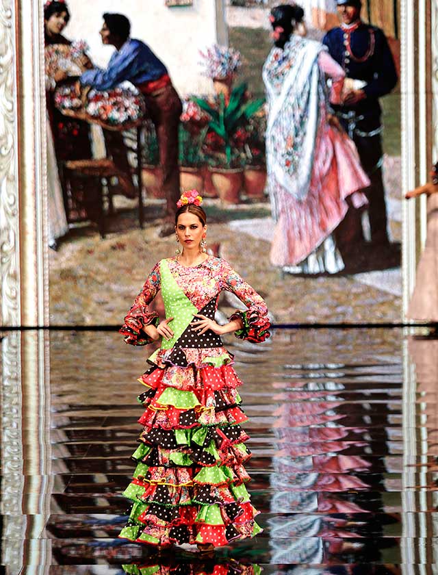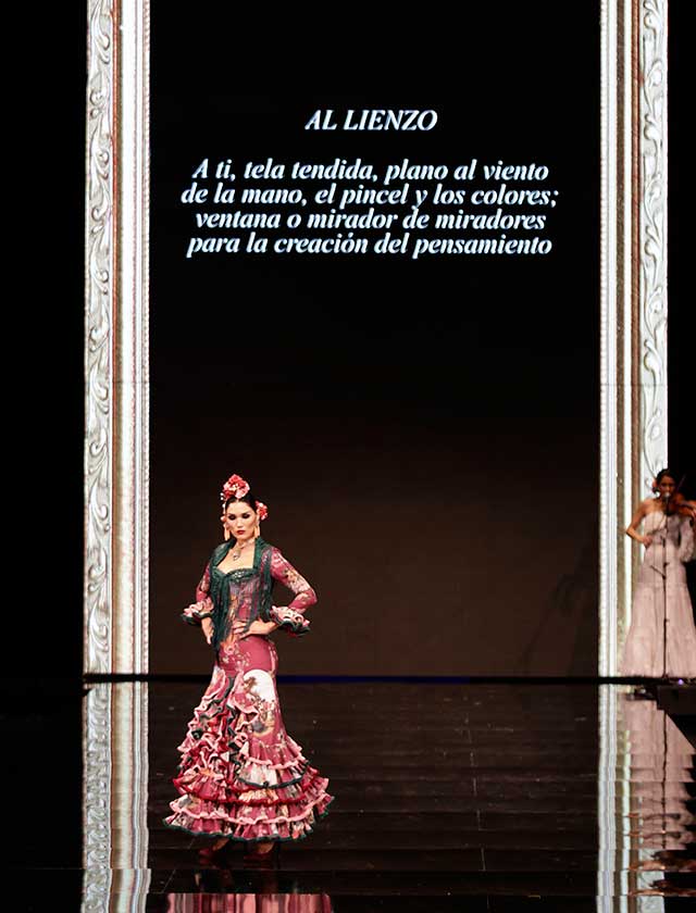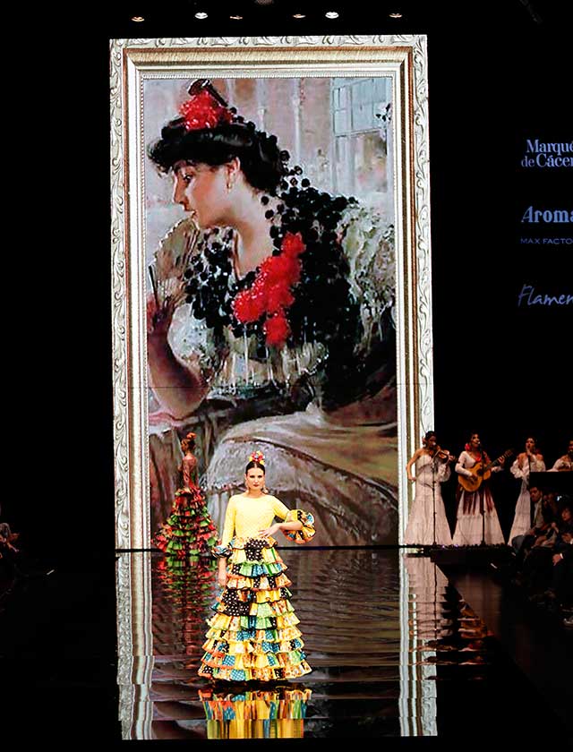 La diseñadora dedica esta colección con la que celebra 40 años de exitosa carrera «A la pintura», con dos bloques diferenciados: pintores costumbristas sevillanos del siglo XIX y color y geometría pop. (J. M. Serrano / Vanessa Gómez)
