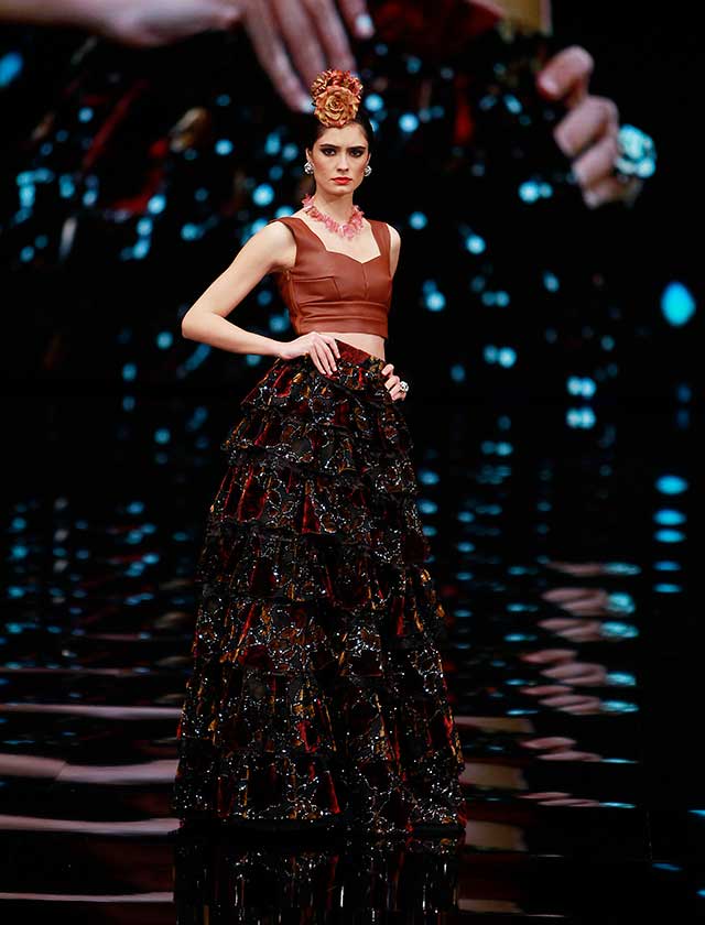 Ana Morón: La diseñadora ha presentado «Volaré», una colección de vestidos que modernizan las formas y texturas con estudiados volúmenes y transparencias que crea una silueta flamenca más contemporánea (J. M. Serrano / Raúl Doblado)