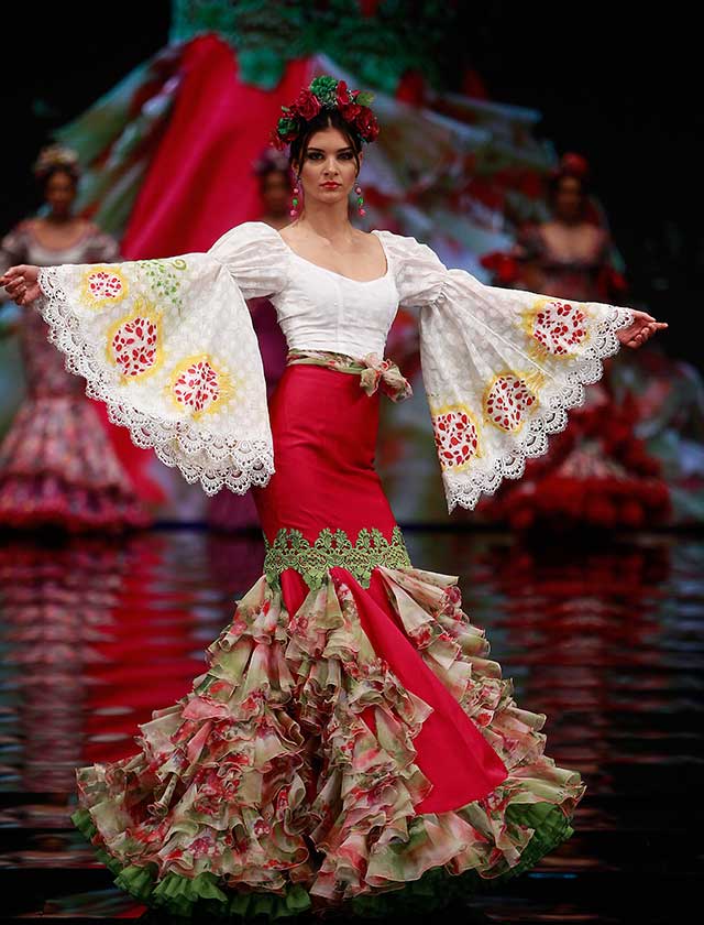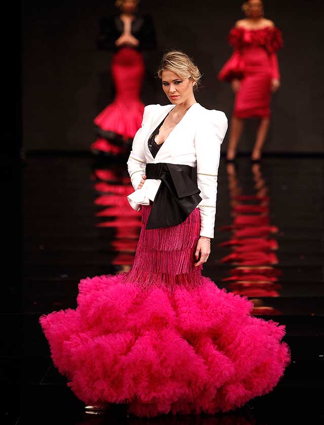 Cristina García: La colección «Mi Dolores» está inspirada en un amor de los de antes. Desde la pureza de dos jóvenes que se conocen, representada en el color blanco, hasta la pérdida del amor sólo separado por la muerte, representado en el color negro, pasando por la dulzura de los primeros besos (amarillo y melocotón) y la pasión de sus cuerpos (rosas y rojos). (J. M. Serrano / Raúl Doblado)