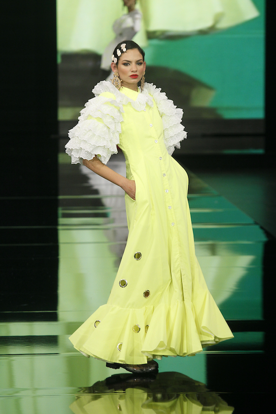 En «Carmela», la colección que José Raposo ha presentado en SIMOF 2020 el diseñador apuesta por el amarillo fluorescente para la flamenca de esta temporada, en originales combinaciones con tonos blanco, negro y azul marino. Lunares, rayas, cuadros, lazos troquelados se combinaban en patrones clásicos fusionados con otros innovadores, al estilo de la firma.
