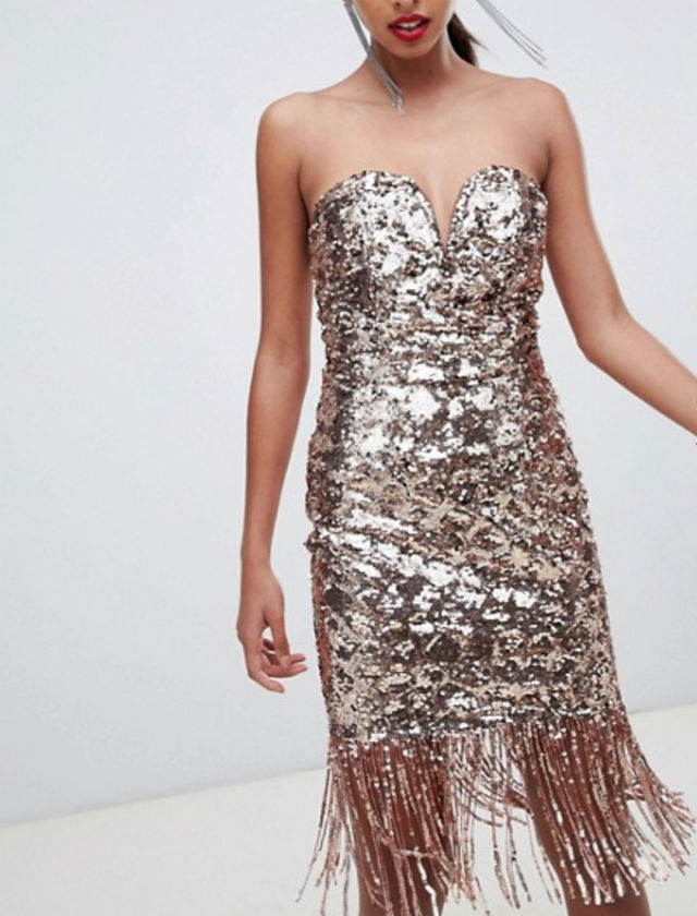 Un vestido de lentejuelas de escote corazón, corto y con flecos de TFNC