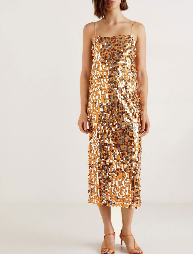 Un vestido de lentejuelas dorado para las que quieran sentirse burbujita de Freixenet. De Mango