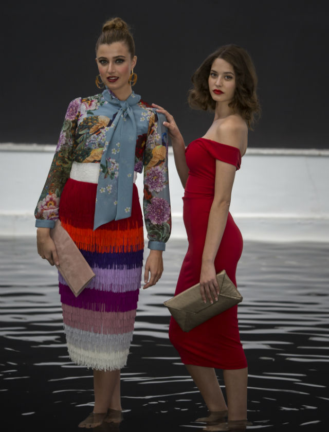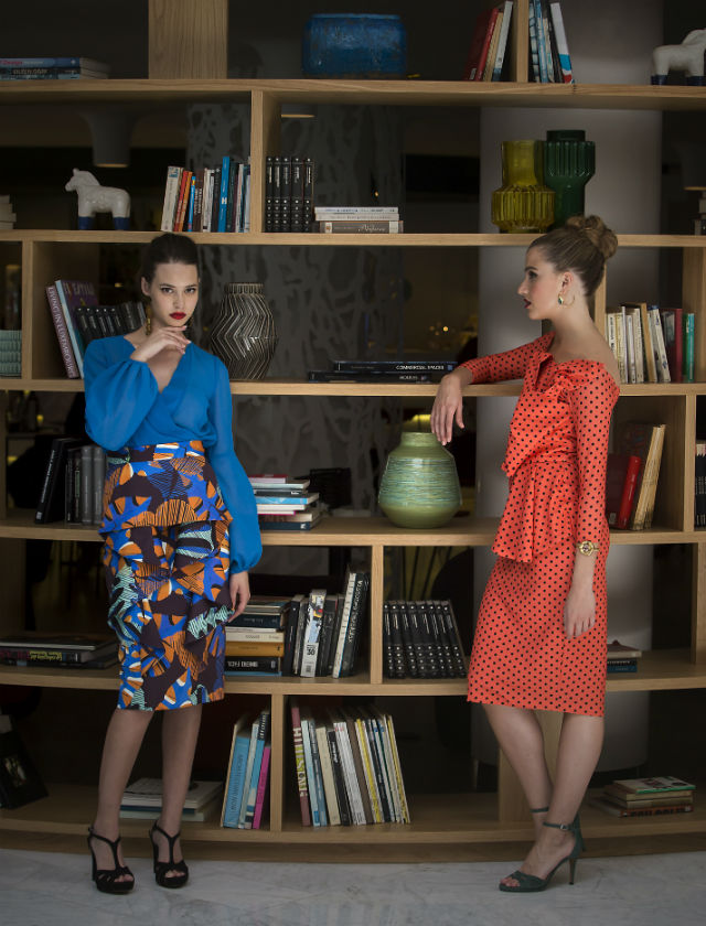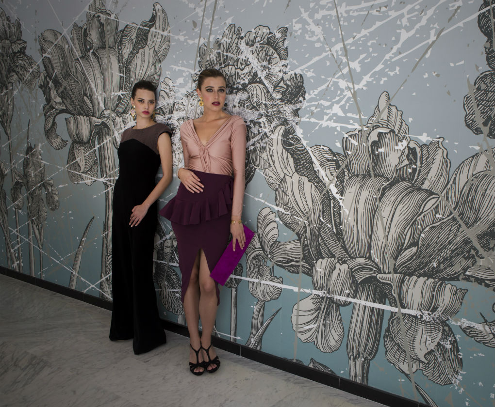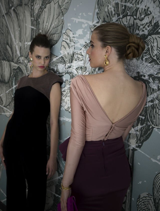 Anabel con vestido de Heloise,y cartera de Nuria Cobo. Lola lleva blusa y falda de Javier Jiménez, cartera de Nuria Cobo y pendientes y earcuff de Casilda Finat.