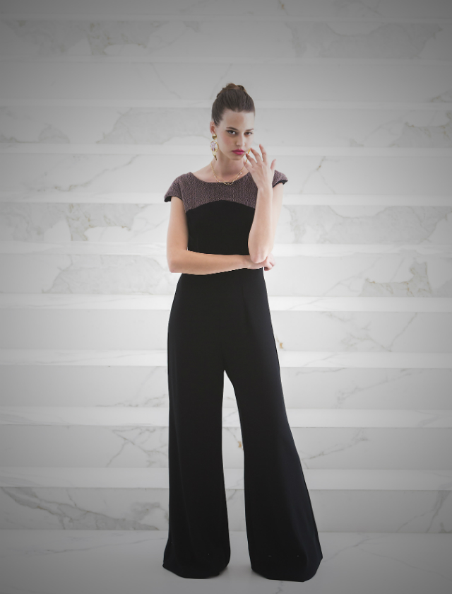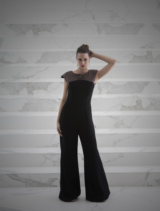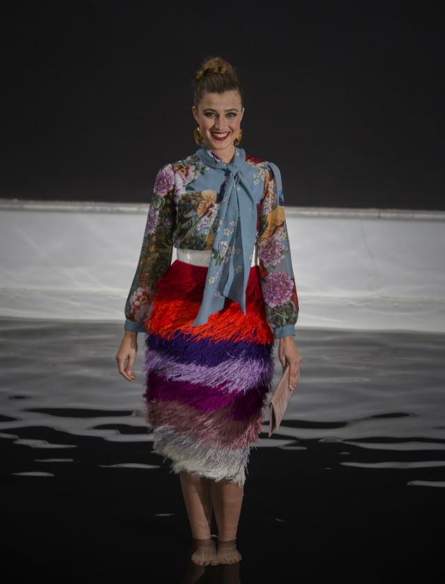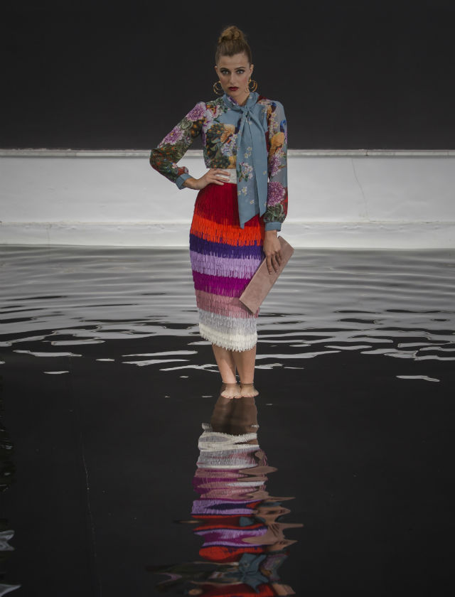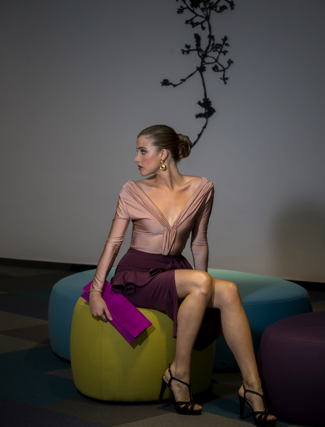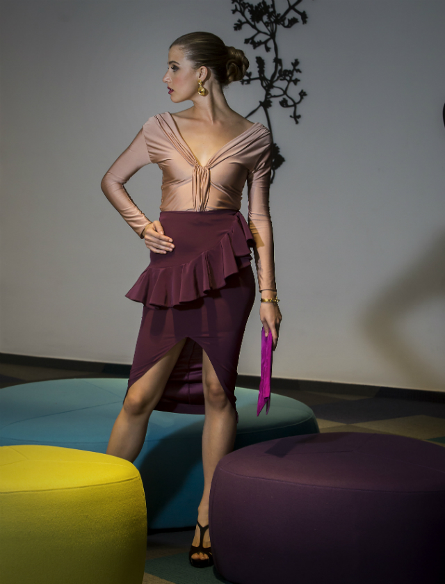 Lola lleva blusa y falda de Javier Jiménez, cartera de Nuria Cobo y pendientes y earcuff de Casilda Finat.