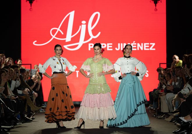A su vez, Pepe Jiménez, también fue uno de los más esperados de la tarde con artesanía realizada a mano en la comarca del Andévalo y texturas en georgette liso, y estampado de lunares, crepés y tejidos técnicos con prints de diseño exclusivo.