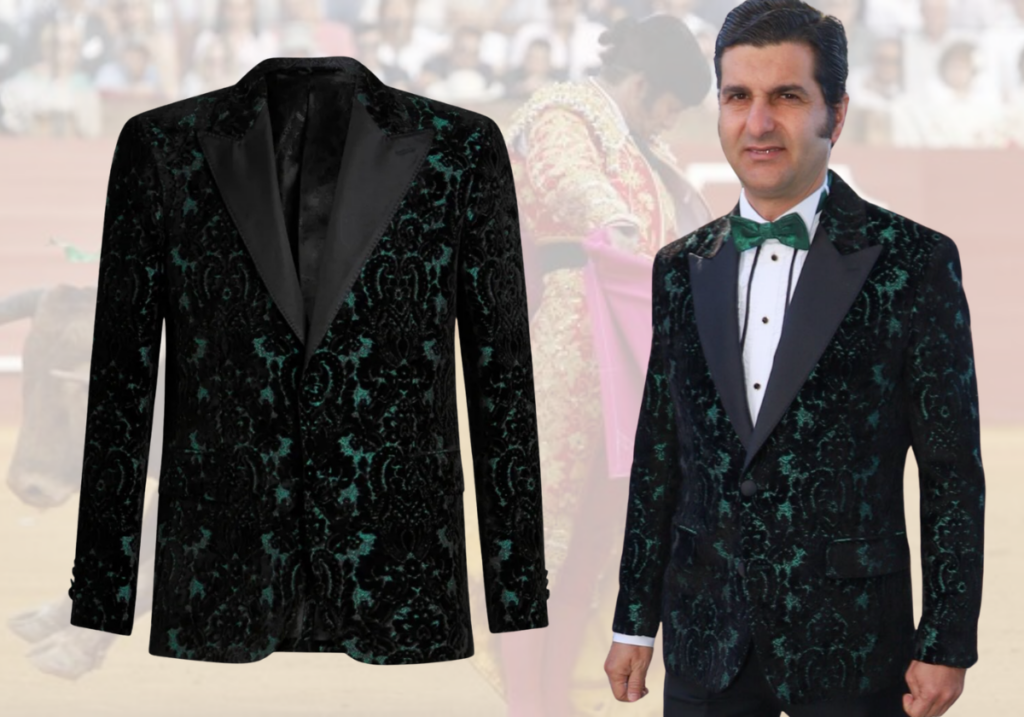 Para la ocasión, José Antonio Morante eligió una americana de terciopelo brocado firmada por Etro, una pieza de fondo negro con dibujo en verde profundo que evocaba el barroquismo clásico tan ligado al universo taurino, valorada en 2.200 euros. Bajo la chaqueta, el diestro optó por una camisa blanca de impecable botonadura acompañada de pajarita en tono verde, en sintonía con el dibujo del tejido, logrando una composición cromática medida al detalle. El pantalón negro, de corte depurado, servía así de contrapunto, equilibrando la fuerza estética de la americana.