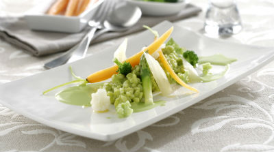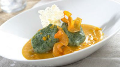 Sorprende a tus invitados con esta original receta en la que las espinacas se convierten en unos deliciosos ñoquis combinados con una crema de calabaza que completa el plato de diez.