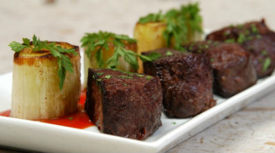 Otra forma de cocinar el solomillo de ternera en dados, en la sartén, y esta vez acompañado de un suculento puré de pimientos del piquillo y puerros caramelizados.