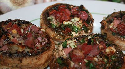 Setas a la plancha rellenas con ajo, jamón serrano y perejil. Una forma sencilla y sabrosa de cenar, las sobras pueden servirte para la comida del día siguiente.