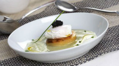 Unos deliciosos huevos escalfados, que no pueden faltar en los brunch, con terrina de patatas y crema de calabacín.