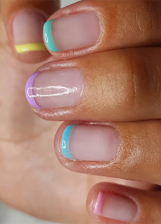 Dentro de la manicura francesa con color, también destaca esta temporada la combinación de distintos tonos pastel como el amarillo, el rosa, el lila, el verde o el azul. Son también manicuras que resaltan el bronceado propio de las manos en estos meses del año, por lo que resultan muy favorecedoras a la par que sutiles, ya que suponen un ligero toque de color.