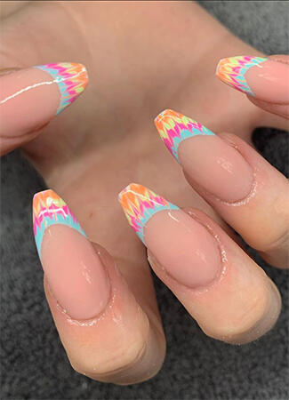El estampado de moda del verano puede convertirse en una original reinterpretación de la manicura francesa, si aplicamos el estampado psicodélico al filo de la uña. Puede ser todo lo llamativo que queramos, aunque si lo deseamos podemos lucir una versión sutil que tan solo proporcione un toque de color a nuestras uñas de una manera original.