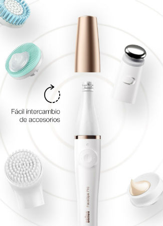 Braun FaceSpa Pro te permite disfrutar de hasta 7 tratamientos con un solo aparato: solo tendrás que cambiar los accesorios. Elimina con precisión el vello facial de raíz con la depiladora y limpia la piel en profundidad con el cepillo facial. También cuenta con un cabezal tonificador de micro vibración que mejora el aspecto de la piel, una almohadilla revitalizante que proporciona un masaje facial suave para estimular la circulación sanguínea, cepillo de exfoliación y una esponja de maquillaje para aplicar corrector y base de forma uniforme.