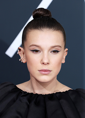 El delineado «ojo de gato» estuvo también muy presente en la alfombra roja del hotel Beverly Hilton. Salma Hayek, Zoë Kravitz y Millie Bobby Brown lo lucieron. Pero no podemos dejar pasar el look impecable de la joven actriz de «Stranger Things», con un maquillaje nude dominado por el eyeliner felino, pendientes «ear cuff» y un original moño «top knot» elaborado con trenzas desde la nuca. Un look realmente favorecedor.