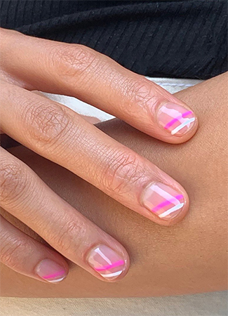 Discreta, favorecedora y muy original. Así puede ser tu manicura de novia si decides optar por un diseño tan sencillo y único como este. Un par de líneas de color que te permiten jugar con los tonos de tu look sobre un tondo transparente con acabado de gel. Imagínalo en combinaciones como el lila y el amarillo pastel, el azul bebé y el blanco o el rosa palo y blanco. ¡Serás una novia única!