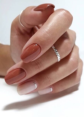 Hoy en día muchas novias buscan manicuras con un poco de color para el día de su boda. Y saliendo de la gama de los rosas o incluso los rojos, cada vez más frecuentes, también podemos encontrar colores idóneos para cada estación. Como este marrón cálido con acabado de gel que han combinado con manicura desnuda y un toque minimalista sobre la cutícula en los dedos anular y meñique.
