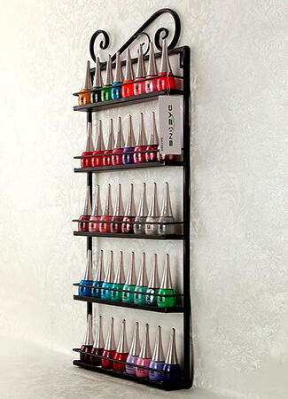 Aparte de los típicos organizadores de esmaltes con varias alturas tipo «display», puedes aprovechar al máximo el espacio colocando estantes de este tipo en la pared. Con ellos no habrá esmalte que pueda quedar en el olvido, porque todos los envases quedan bien visibles y al alcance. Además, en la pared apenas ocupan espacio.