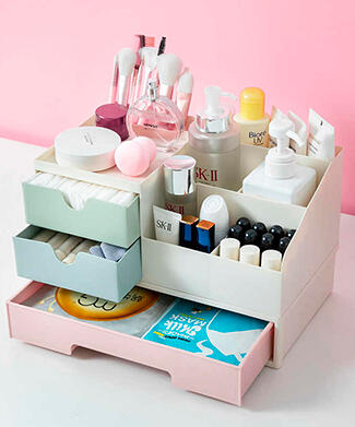 En la misma línea, este tipo de organizadores multitusos resultan muy prácticos para guardar tanto maquillaje como productos y accesorios cosméticos. La parte de arriba es diáfana, con lo que permite colocar casi cualquier tipo de producto, mientras que los cajones permite guardar otros accesorios que sea mejor preservar del polvo y la suciedad, como los algodones. También paletas y labiales, por ejemplo.