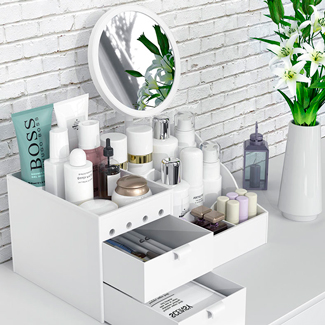 Si no tienes tocador, este tipo de organizadores con espejo y luces LED incorporadas te permitirán crear uno para tener todo ordenado y a mano a la hora de maquillarte o realizar cualquier ritual de belleza. Basta que lo coloques sobre cualquier cómoda o mueble, ya sea en el dormitorio o el baño, para crear tu pequeño rincón «beauty».