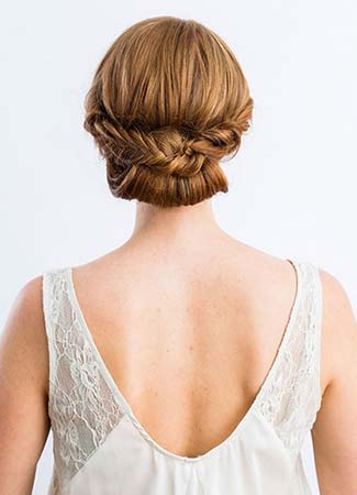 Comienza con una trenza sencilla a cada lado de la cabeza, dejando en medio una sección de cabello que anudaremos con una gomilla en la parte final. Después, se enrolla esa sección central sobre sí misma formando un rulo horizontal que se sujeta con horquillas. Para terminar, se cruzan por encima las trenzas de manera estética para decorar el recogido. Ver paso a paso.