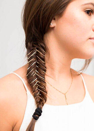 Algo tan cotidiano como una trenza se convierte en un peinado chic y sofisticado gracias a la superposición de horquillas metálicas. Solo tienes que procurar colocar las horquillas en los mechones de la trenza de espiga para que quede estético.
