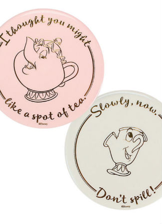 Te invitamos al festín para que disfrutes de tu bebida preferida sobre estos fantásticos posavasos de La Bella y la Bestia. Los dos presentan ilustraciones doradas y una frase destacada de la película. El posavasos de la Sra. Potts incluye la frase «I thought you might like a spot of tea» («Pensé que te apetecería una taza de té»). El posavasos de Chip incluye la frase «Slowly, now. Don't spill!» («¡Despacito y no lo viertas!»).