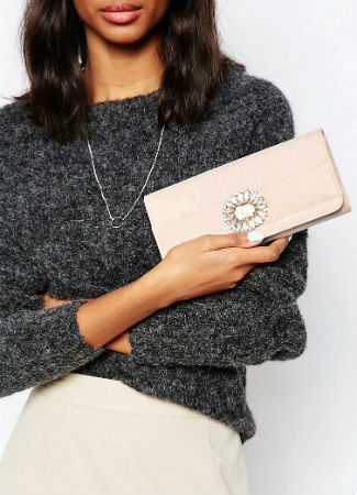 El rosa cuarzo es el color del año y por eso nunca está de más tener un bolso bonito en ese tono tan deseado. Encontramos uno de estilo cartera de la firma Carvela con un detalle-joya y efecto satinado que lo convierten en una opción perfecta para cualquier ocasión especial.