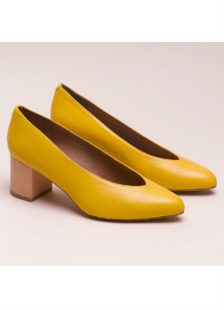 Esta bailarina en piel ovina tiene tacón medio (5,5 centímetros) con puntera en forma de pico. Es un tacón forrado en madera muy ligera y el interior del zapato es de piel. Tiene uno de los colores de la temporada, los tonos amarillos, y una de las formas más buscadas, ese estilo de bailarina de aire retro con corte cerrado de pico.