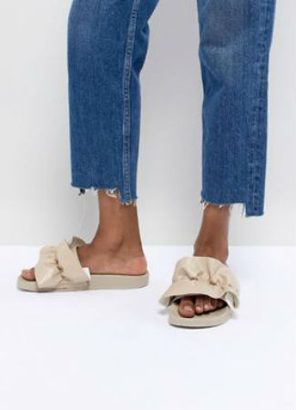 Las sandalias planas con una sola tira ancha están a la última. Para ir a la playa, pero también para el día a día. Este modelo de la firma Slydes llama nuestra atención por el detalle fruncido de tipo volante, su color natural y su comodidad extrema. ¿Te apuntas?