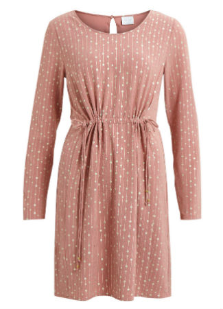 Si resulta que no es cena y que es una reunión a la hora de comer puedes elegir un minivestido de manga larga en rosa empolvado con detalles de pequeños lunares y rayas en blanco. Puedes combinarlo con complementos en plateado o dorado para conseguir un look perfecto de fiesta de día.