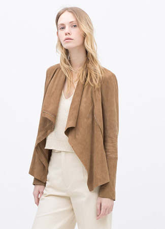 Es uno de los materiales estrella. Una opción en color camel que la convierte en una prenda polivalente. Además de tener un corte fluido y de aspecto abierto, puede cerrarse con cremallera. Perfecta si la llevas con una camisa blanca, pero también con camiseta informal.