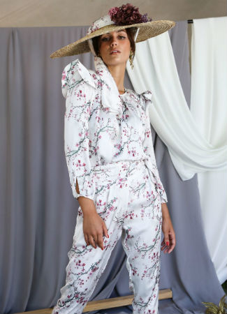 Encontramos en Panambi este conjunto de camisa y pantalón estampado floral de satén. Por sus colores suaves y por la tendencia del total look nos parece una opción muy interesante para tu próximo evento. Pantalón recto y camisa de manga larga con detalle de hombreras y volantes.