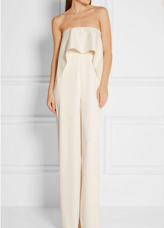 Esta novia es urbana y juvenil. Elige un mono en color crema sin mangas y con un volante en el escote, de pata ancha y largo cubriendo el zapato. No hace falta llevar sujetador porque el mono trae una estructura interna que permite lucir espalda en un día especial como el de tu boda.