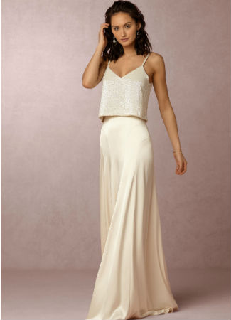 Si te gusta el estilo lencero para las novias y quieres ir muy sencilla, este top y esta falda larga de BHLDN puede ser lo que estás buscando. La parte superior lleva incrustada cientos de cuentas que lo convierten en una pequeña joya y la caída de la falda con botones atrás, es espectacular.