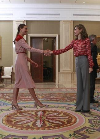 La Reina Doña Letizia recibió en audiencia a una representación de la XVII campaña solidaria «Un juguete, una ilusión» de la que es madrina Eva González. Para su encuentro, la modelo eligió un vestido en rosa nude con hombreras en rojo de la colección The Classics de Antonio García. Un vestido tipo abrigo con un minicinturón, elegante y muy sofisticado.