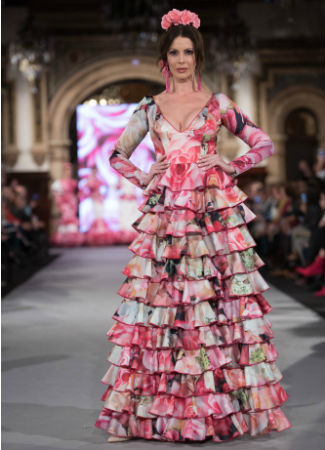 Hace ya varios años que el talle de los trajes de flamenca comenzó a subir drásticamente. Y aunque aún siguen siendo diseños puntuales en las colecciones de los diseñadores, comienzan a ser muy habituales y deseados tanto dentro como fuera de la pasarela. Este diseño es de Santana Diseños, resulta muy favorecedor sobre todo para mujeres altas que pueden lucir esa falda impresionante de pequeños volantes que comienza en la cintura y llega hasta el suelo. Foto: Aníbal González